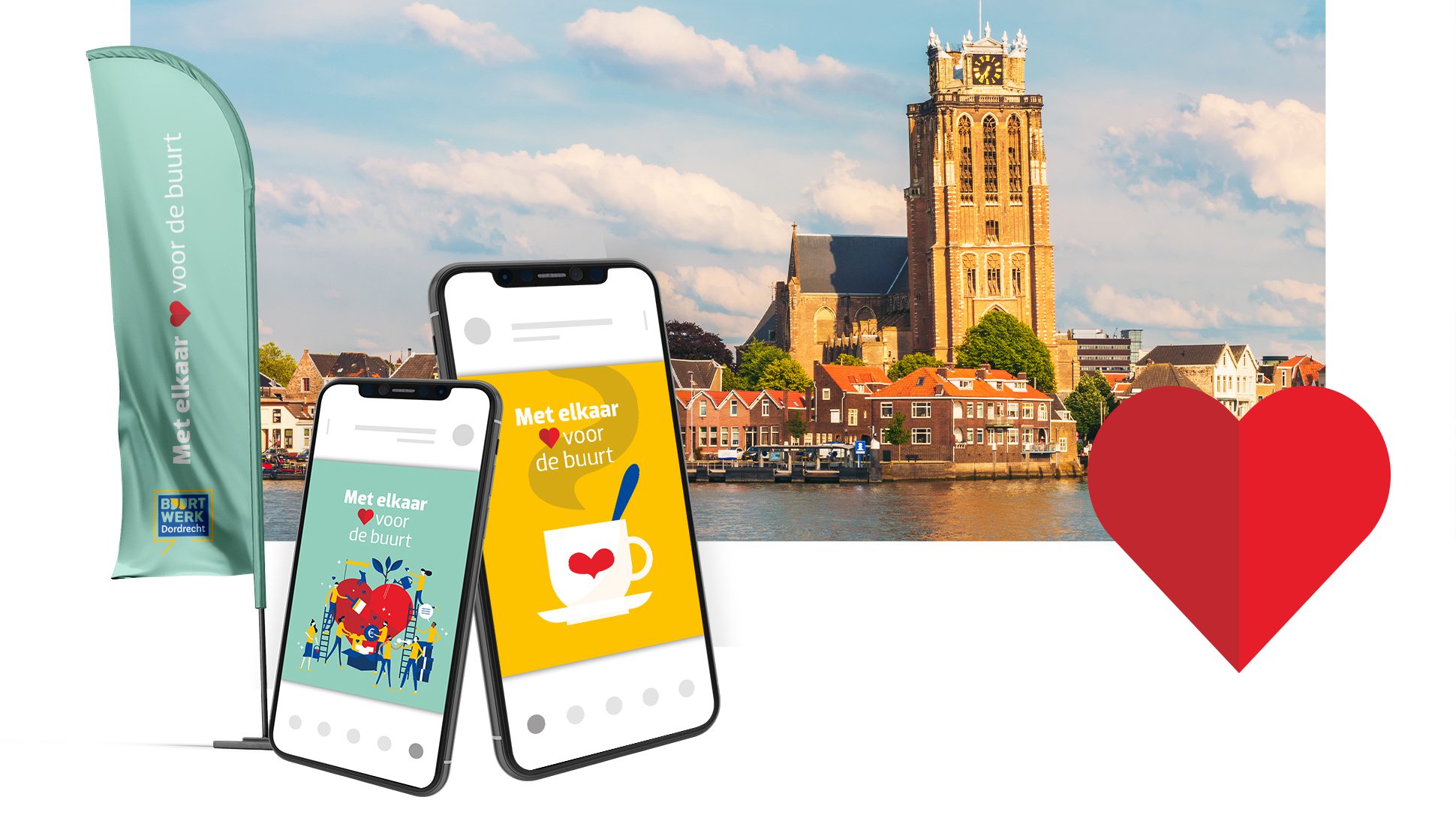 De campagne ‘Met elkaar ❤️ voor de buurt’ laat in woord én beeld zien waar Buurtwerk Dordrecht voor staat. Een samenleving waar we oog hebben voor elkaar, waar iedereen een bijdrage levert en bouwt aan een gezamenlijke toekomst. De campagne is heel herkenbaar en betrekt bewoners op een positieve manier bij hun wijk.