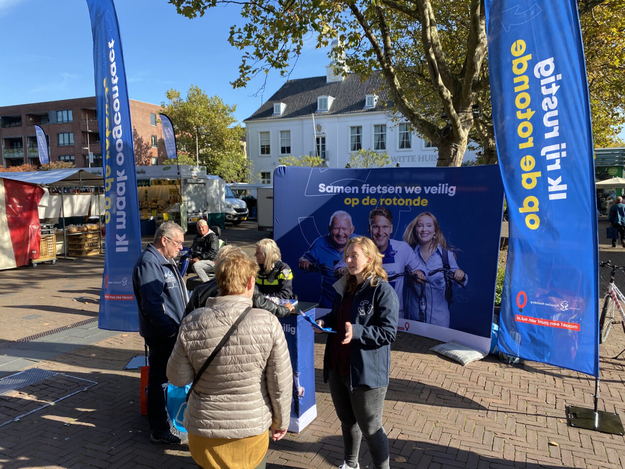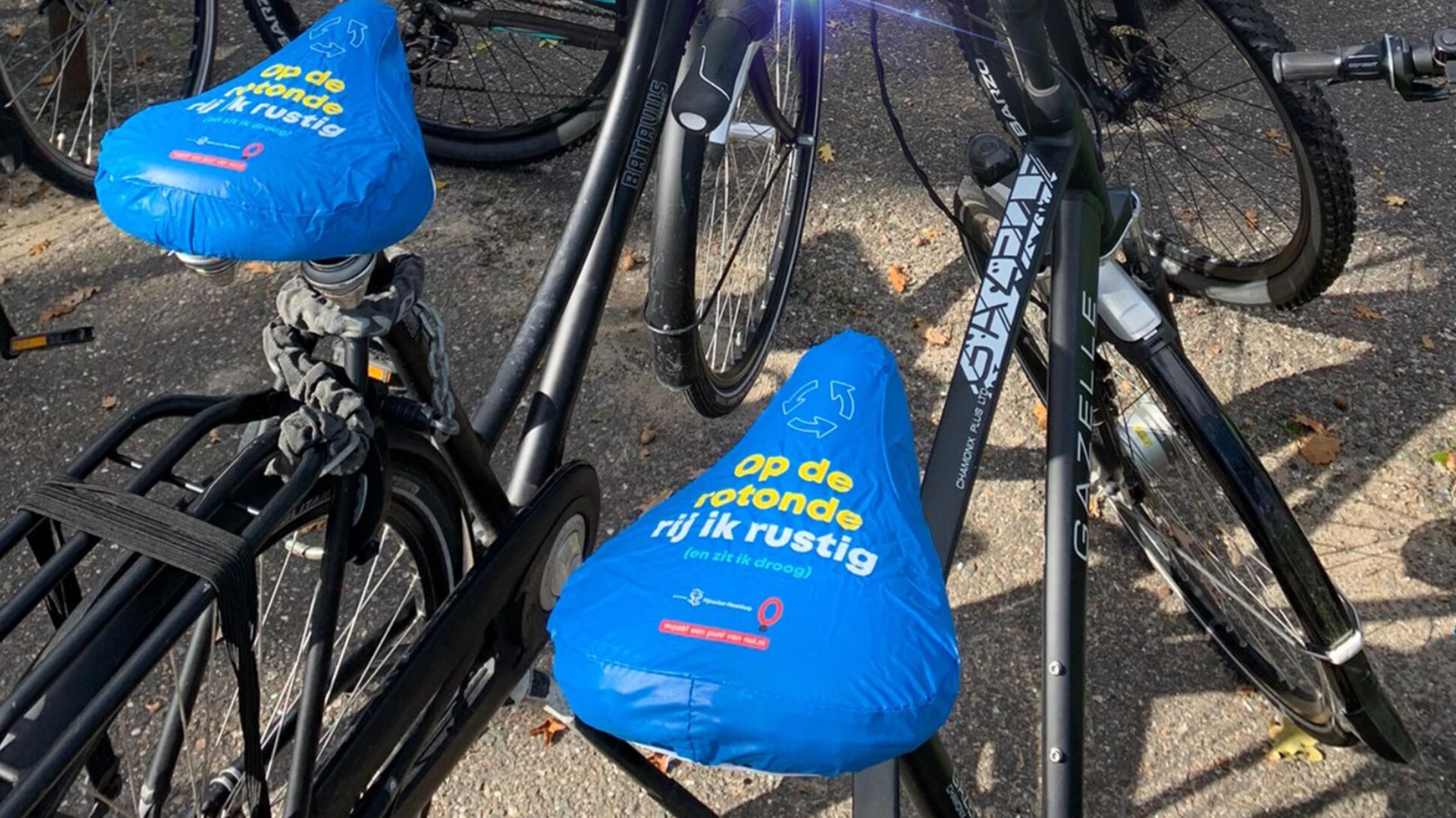 Om de inwoners te bereiken vonden er drie strategisch gekozen interventies plaats, afgetrapt met de wethouder. We zochten de doelgroep op en gingen het gesprek aan. In een ontspanning setting krijgen fietsers concrete tips voor veiliger gedrag op de rotondes. Daarnaast plaatsten we langs de locaties verschillende uitingen die als reminder functioneren en oproepen tot het gewenste gedrag. Die herhaling van instructies is cruciaal in het stimuleren van wenselijk gedrag. Dat doen we dan ook via uiteenlopende manieren zoals permanente signing, krijtverf-sjablonen op het fietspad, artikelen in de lokale krant, posters, social media, zadelhoezen, zonnebrillen en flyers.